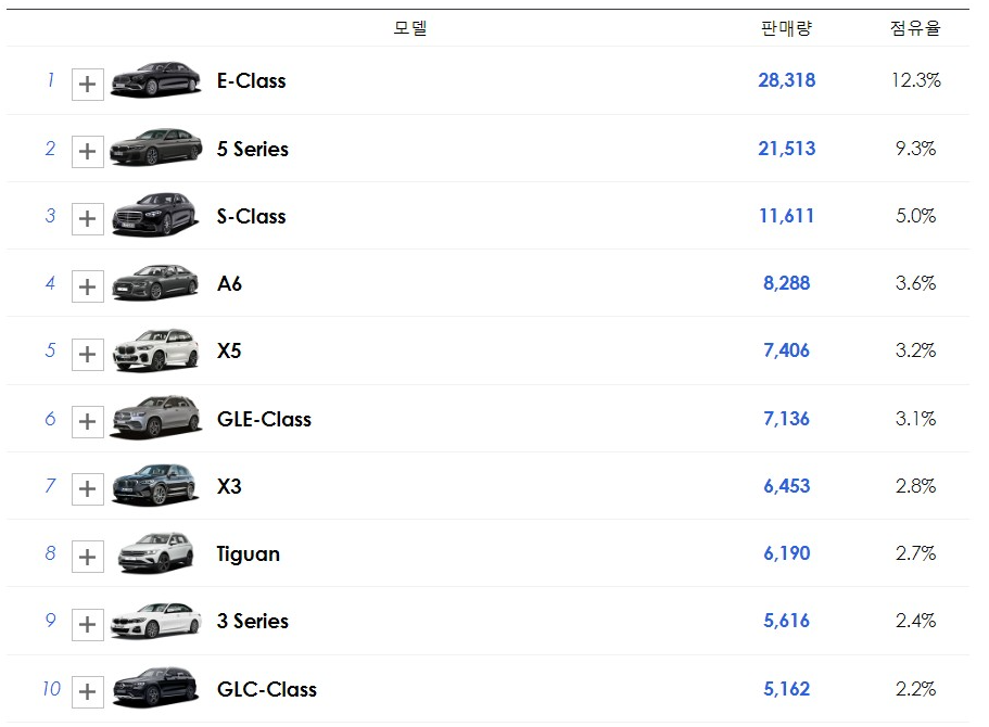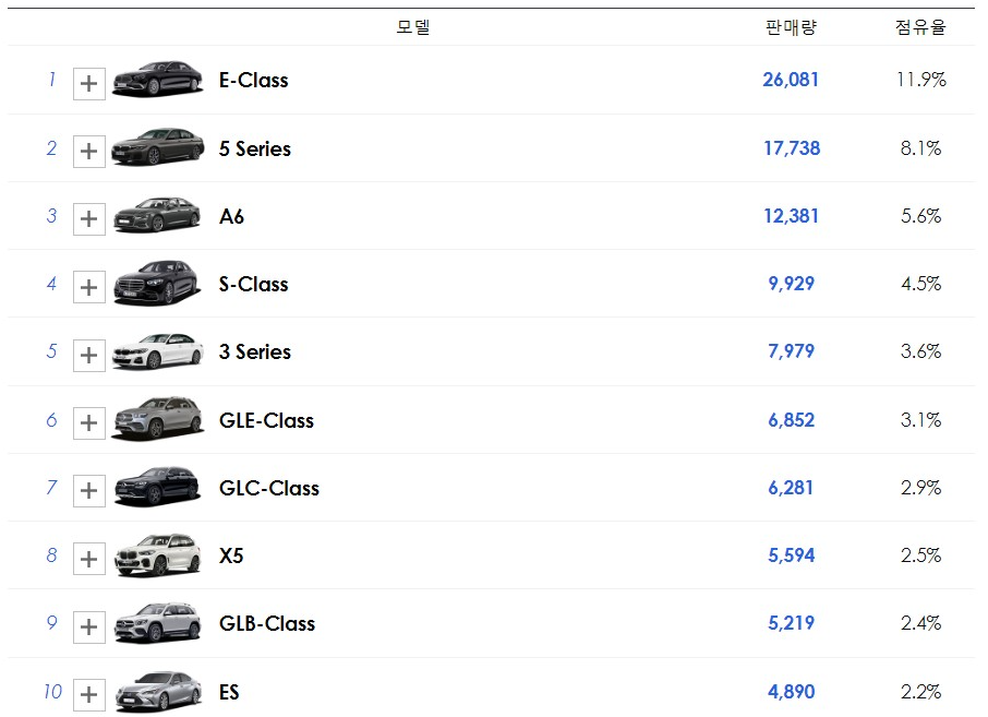 국내 2021년과 2022년의 판매량을 보면 2년간 E클래스와 5시리즈가 1위와 2위를 하고 있는 것을 보고 있습니다. 그리고 직전 연도에는 21년보다 격차를 줄인 모습입니다. 점유율도 1.2% 상승했습니다. 그리고 앞으로 두 1,2위 모델의 신형 모델 경쟁을 통한 판매량이 흥미로운 관전 부분입니다.