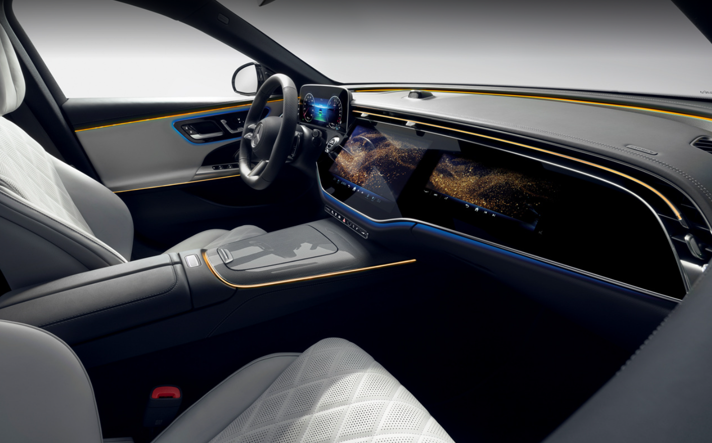 선택가능 MBUX 슈퍼스크린이 적용됩니다. 이 디스플레이는 센터의 액정과 조수석의 디스플레이와 일체형으로 제공이 됩니다. 또한 액티브 앰비언트 라이트를 통해서 스피커를 통해 나오는 음악 등을 귀로뿐만 아니라 눈으로도 즐길 수 있는 기능을 가지고 있습니다.