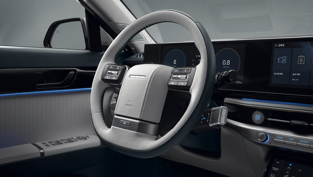 또한 이번에 7세대 디올뉴 그랜저는 미래지향적인 디자인을 적용했음과 동시에 한시대 부의 상징이었던 각 그랜저를 오마주 하여 기념비적인 모델로 출시를 하였습니다. 가장 눈에 띄는 것은 스티어링 휠입니다.